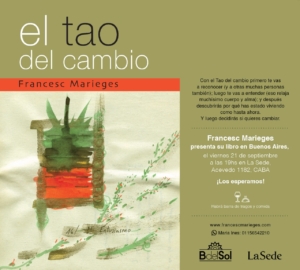 El próximo viernes 21 de septiembre, a las 19h, tendrá lugar la presentación del libro El Tao del cambio, de Francesc Marieges, en la librería LaSede, Acevedo 1182, de Buenos Aires (Argentina).